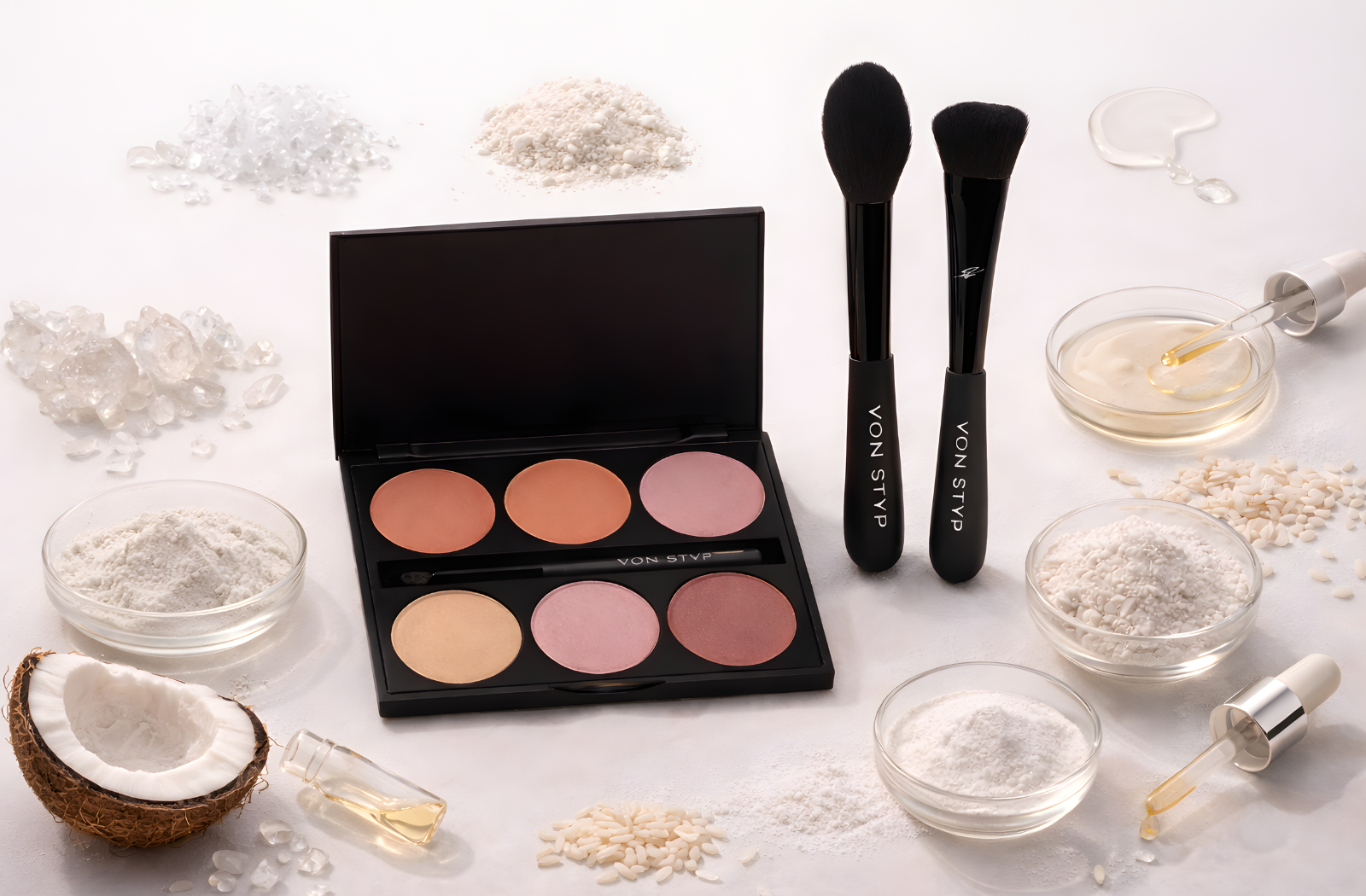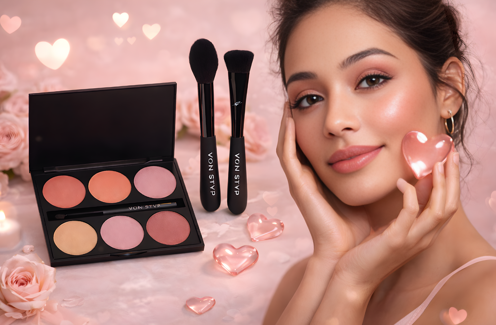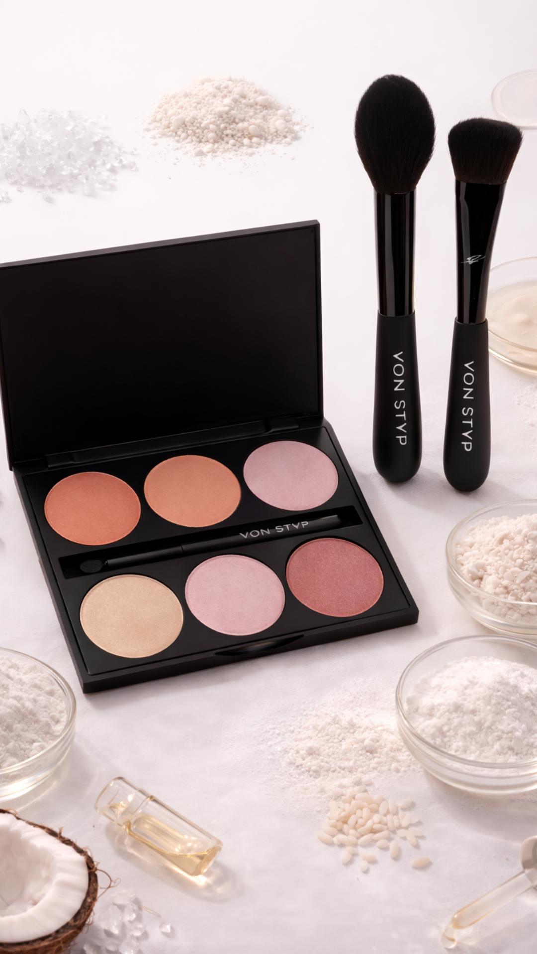 Das Mystique Blush Love Set vereint die Around the World Blush Palette mit zwei ausgewählten Mystique Pinseln – perfekt abgestimmt für sanften Glow, präzises Auftragen und ein harmonisches Finish.