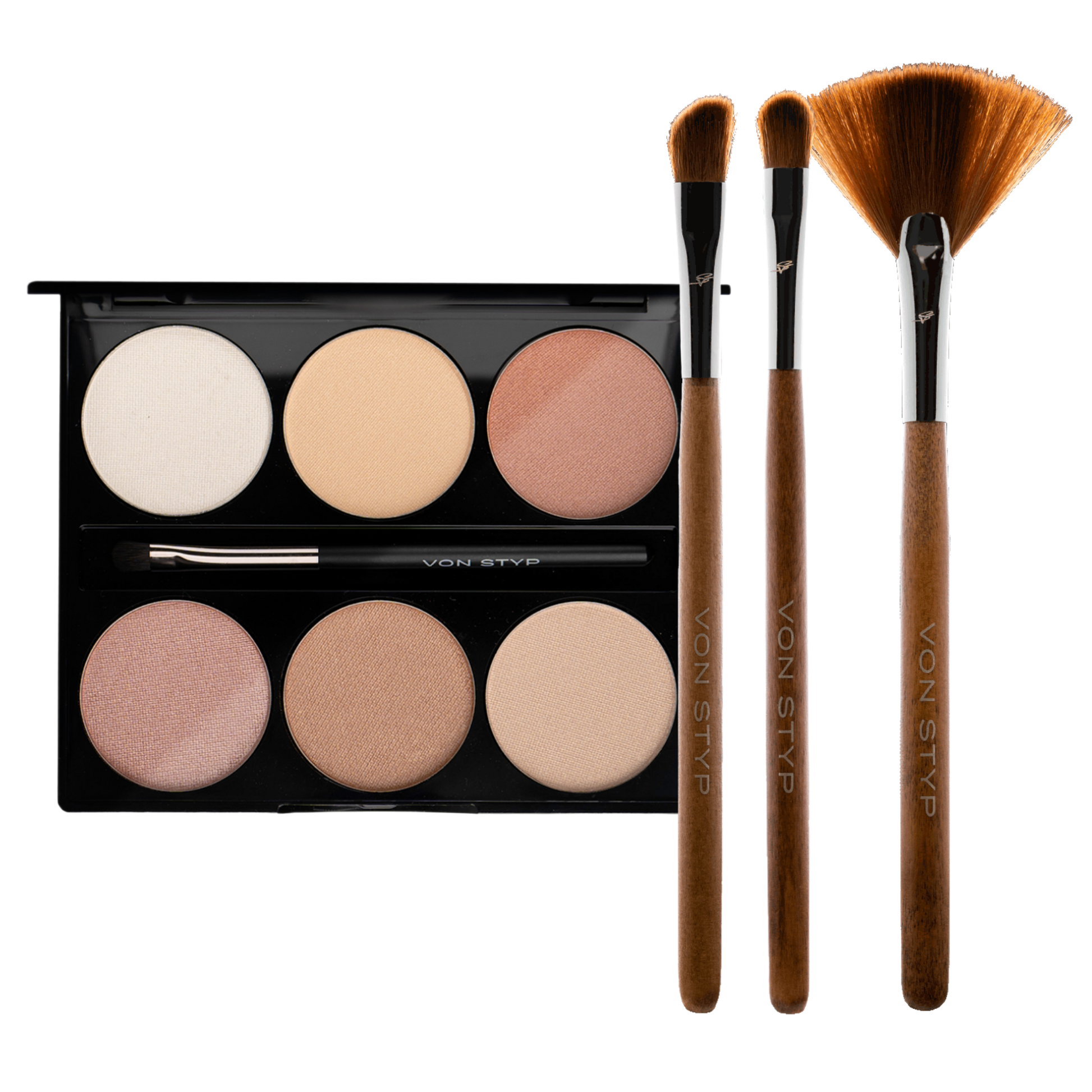 Highlighter palette & 3 natural brushes with birchwood handles – clean, vegan & sustainable.
